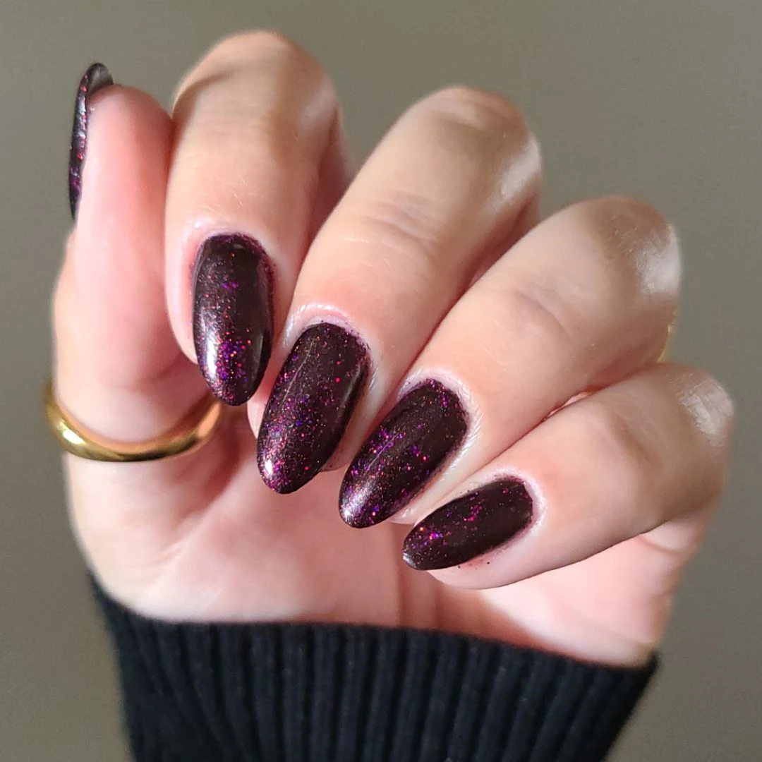 A rich plum base with warm ruby undertones, drenched in fine violet and crimson shimmer. This decadent multi- dimensional mix of midnight plum and fiery glitter is pure luxury. Rich and sultry, it makes a bold statement of elegance, delivering a velvet-like finish that’s equal parts mystery and allure.