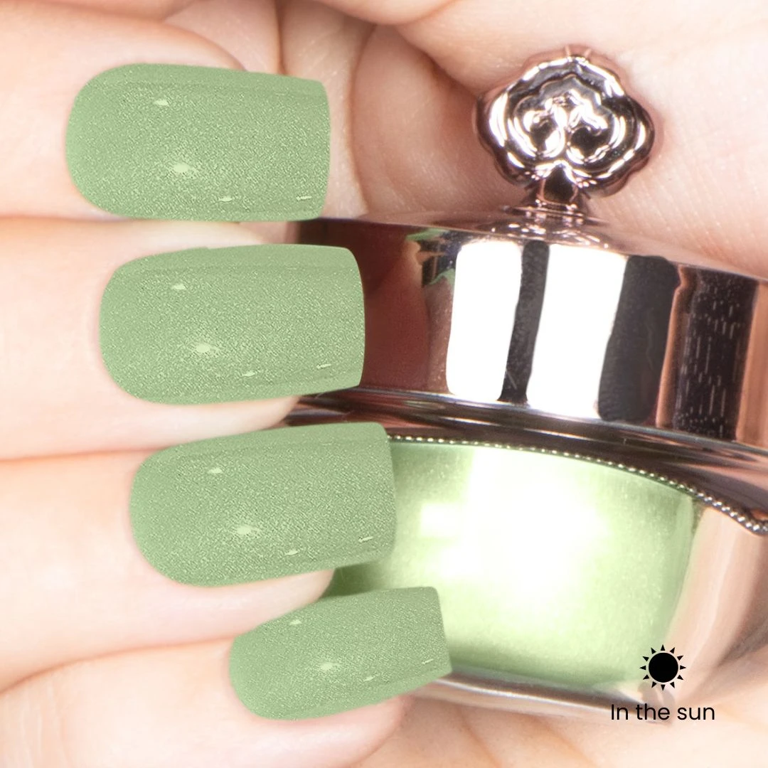 Step into nature’s embrace with Meadow, a tranquil shade that shifts from a fresh, earthy green indoors to a rich, bright green under sunlight. This color-changing masterpiece captures the essence of a blooming meadow, adding a touch of serenity and vibrancy to your look. Perfect for those who love a subtle yet stunning transformation.