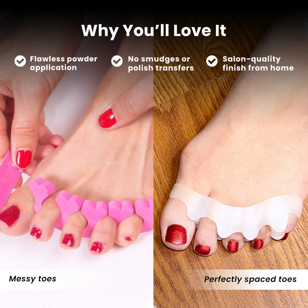 Achieve flawless toes every time. Sistaco Perfect Pedicure toe separators are designed to gently cushion and space your toes, allowing you to apply your Sistaco nail powders with precision and ease. Made from soft, skin-friendly material, they help prevent smudging and relieve pressure for a truly comfortable experience. Washable, reusable, and a must-have in every beauty kit.